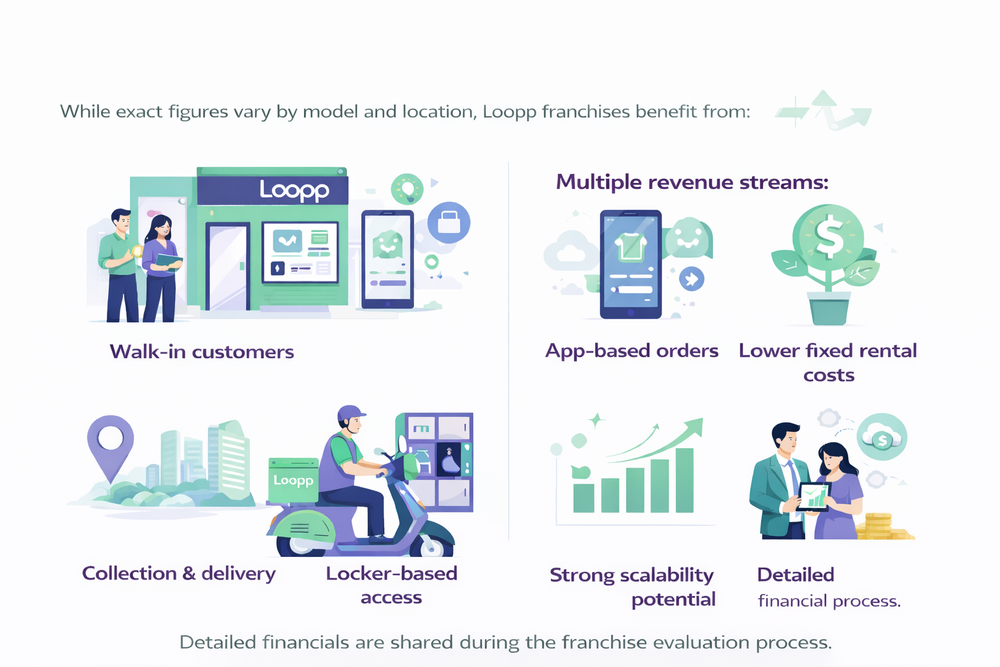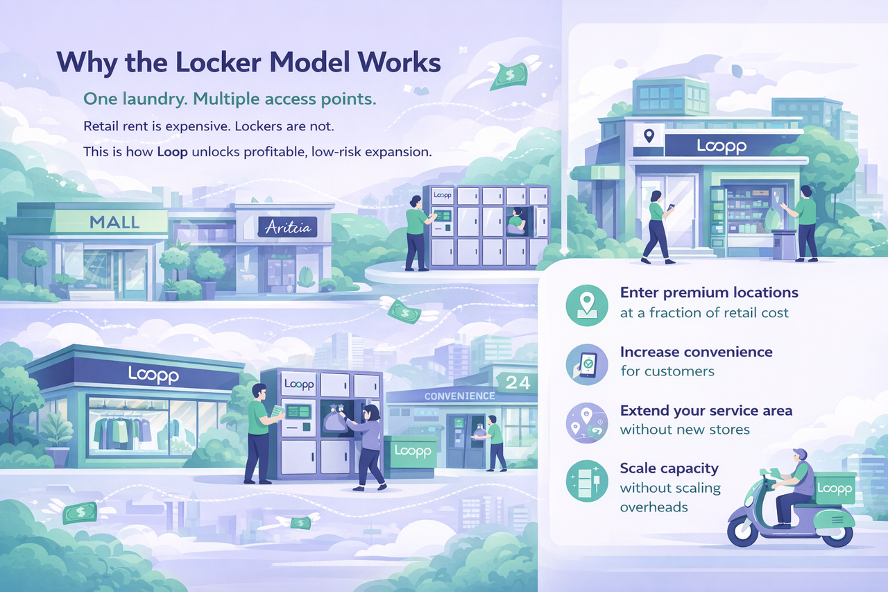 Own a Loopp franchise and bring app-powered laundry, smart lockers, and automated systems to your area — with lower overheads and multiple revenue streams.